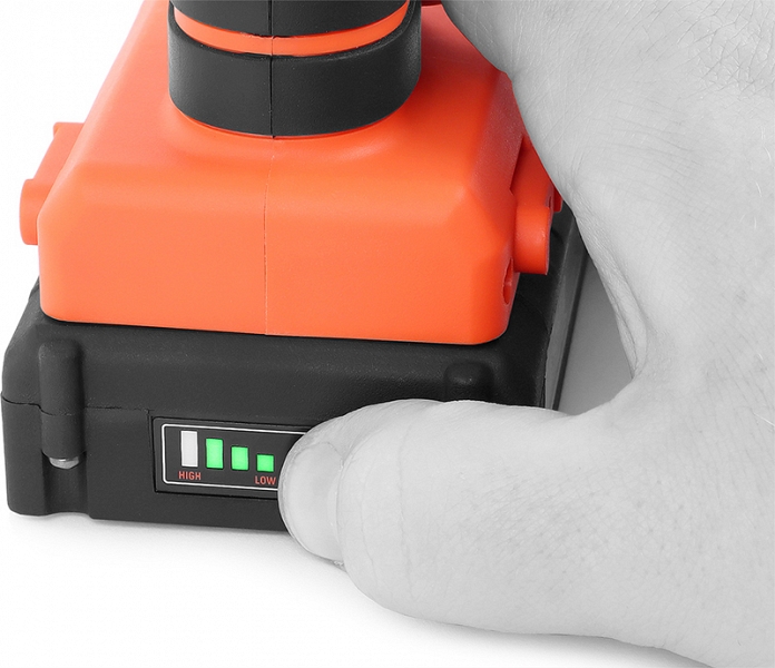 - 2 съемных Li-ion аккумулятора напряжением 20 В, емкостью 2,0 Ач с четырехуровневой индикацией заряда и быстрое зарядное устройство: время зарядки 60 минут