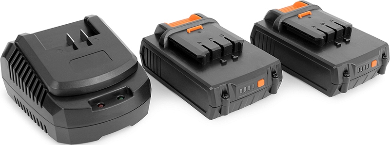 - 2 съемных Li-ion аккумулятора напряжением 18 В, емкостью 2,0 Ач со светодиодной индикацией зарядки