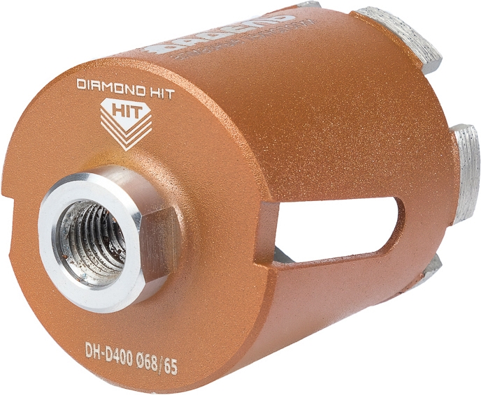 Технология Diamond Hit – новейшая технология алмазного сверления в железобетоне, ФБС, кирпиче без подачи воды («в сухую») и дополнительного вскрытия алмазных сегментов в процессе работ. Ударные дрели или специальные двигатели сверлильных машин и уникальные алмазные коронки позволяют профессионально сверлить железобетон с высоким армированием и абразивные материалы. - Сухое сверление армированного бетона: