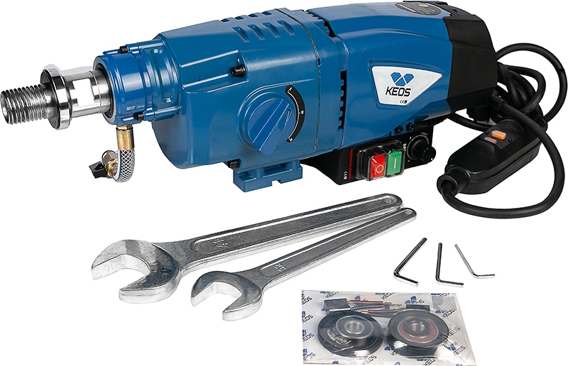 Алмазная сверлильная установка Keos KS-350 Set (Кеос КС-350 Сет) предназначена для бурения отверстий Ø 50 – 350 мм в бетоне, железобетоне, кирпиче и других твердых материалах, под прямым углом. Идеально подходит для прокладки телекоммуникационных и сантехнических сетей, сверления отверстий на строительных объектах.