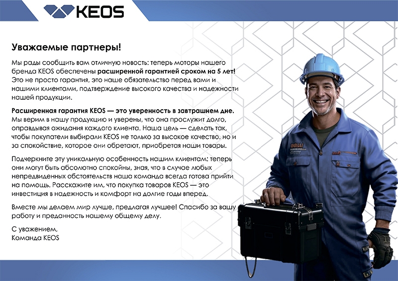 - Уважаемые партнеры! Мы рады сообщить вам отличную новость: теперь моторы нашего бренда Keos обеспечены расширенной гарантией сроком на 5 лет! Это не просто гарантия, это наше обязательство перед вами и нашими клиентами, подтверждение высокого качества и надежности нашей продукции.