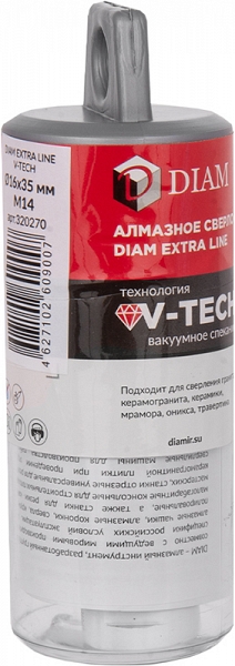 Алмазное сверло вакуумного спекания Diam Extra Line V-Tech M14 16 мм (Диам Экстра Лайн В-Теч М14 16 мм) предназначено для сверления отверстий Ø 16 мм, глубиной до 35 мм в керамике, граните, керамограните, мраморе, ониксе, травертине без водяного охлаждения при помощи ушм (болгарок), перфораторов, дрелей.