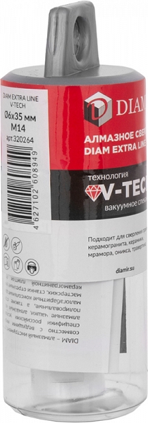 Алмазное сверло вакуумного спекания Diam Extra Line V-Tech M14 6 мм (Диам Экстра Лайн В-Теч М14 6 мм) предназначено для сверления отверстий Ø 6 мм, глубиной до 35 мм в керамике, граните, керамограните, мраморе, ониксе, травертине без водяного охлаждения при помощи ушм (болгарок), перфораторов, дрелей.