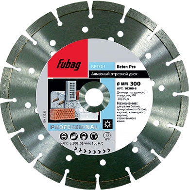 Алмазные диски по бетону и железобетону Fubag Beton Pro (Фубаг Бетон Про) – профессиональный отрезной алмазный диск для сухой и влажной резки бетона, армированного железобетона, кирпича и других строительных материалов. Используется на углошлифовальных машинах (ушм), штроборезах, бензорезах, электрических резчиках, швонарезчиках, плиткорезах электрических, камнерезных станках, стенорезных машинах с подачей и без подачи воды.