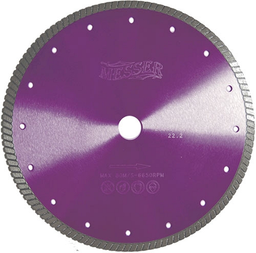Алмазные диски по граниту Messer Turbo G/M (Мессер Турбо Г/М) с турбо-кромкой отлично режут любой тип гранита, а также хорошо зарекомендовали себя при резке железобетона, габбро, базальта, кварцита, клинкера, бакора, твердого камня.