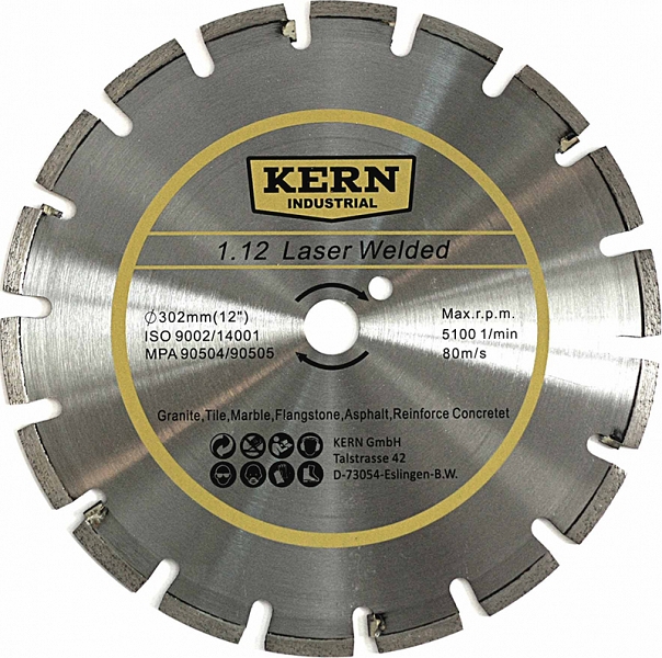 Алмазный диск Kern 1.12 Laser Welded With Protected Tooth 302 мм (Керн 1.12 Лазер Велдед Протектед Тутс 302 мм) – отрезной сегментный алмазный круг для мокрой алмазной резки железобетона, асфальта, гранита, каменных плит, плитки, мрамора и т.п. Используется с бензорезами, электрическими резчиками, электрическими плиткорезами, камнерезными станками, настольными пилами, стенорезными машинами, швонарезчиками и другой алмазной техникой.