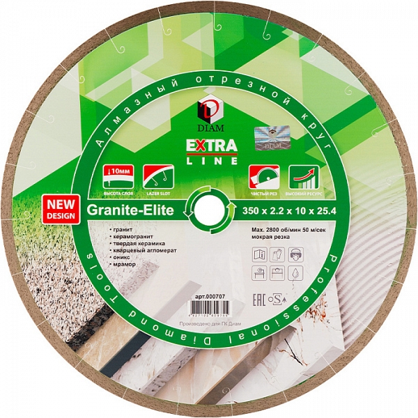 Алмазный отрезной диск Diam Extra Line 1A1R Корона Granite-Elite 350 мм (Диам Экстра Лайн 1А1Р Корона Гранит-Элит 350 мм) – премиальный алмазный круг для мокрой резки гранита, керамогранита, твердой керамики, кварцевого агломерата, оникса, мрамора, габбро, лабрадорита, базальта и других пород твердого натурального камня на бензорезах, электрических резчиках, камнерезных станках, стенорезных машинах, швонарезчиках с подачей воды. За долгое время зарекомендовал себя с отличной стороны у многих мастеров, как инструмент, обеспечивающий очень качественное выполнение задач практически по всем твердым материалам, при этом имеет очень большой ресурс и скорость работы.