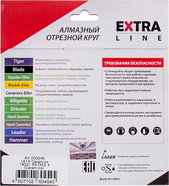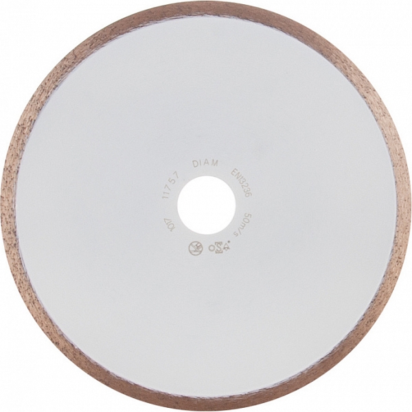 Алмазный отрезной круг Diam Extra Line 1A1R Корона Ceramics-Elite 180 мм (Диам Экстра Лайн 1А1Р Корона Керамикс-Элит 180 мм) – специальный алмазный круг со сплошной режущей кромкой для мокрой резки глазурованной плитки, твердой керамики, керамогранита, мрамора и аналогичных по своим характеристикам материалов на болгарках (ушм), штроборезах и плиткорезах электрических с подачей воды.