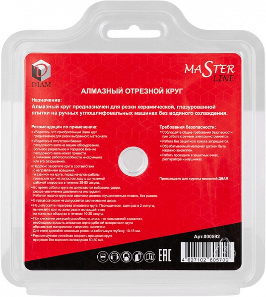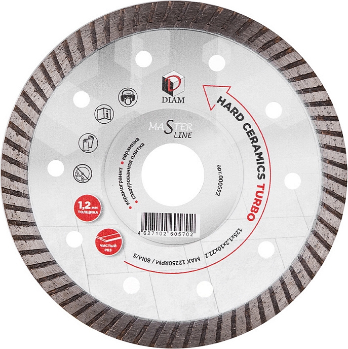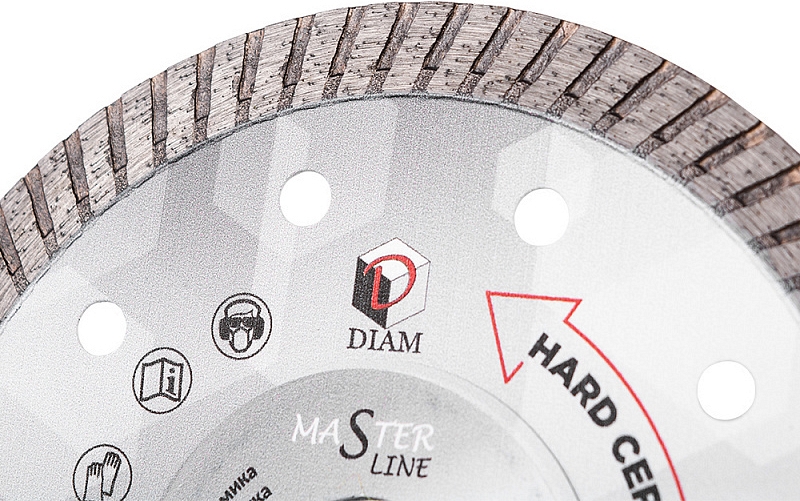 Алмазный отрезной круг Diam Master Line Turbo Hard Ceramics 125 мм (Диам Мастер Лайн Турбо Хард Керамикс 125 мм) – специальный алмазный диск для резки керамики и керамогранита на ручном электроинструменте без применения водяного охлаждения. Отличный вариант для работы с керамическими материалами толщиной до 20 мм.