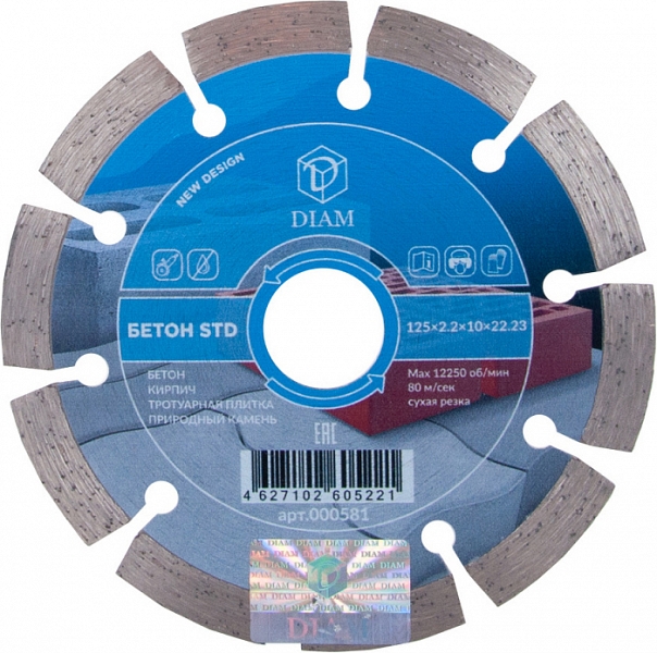 Алмазный отрезной круг Diam STD 1A1RSS Бетон 125 мм (Диам СТД 1А1РСС Бетон 125 мм) – сегментный алмазный диск для сухой резки бетона, кирпича, тротуарной плитки, природного камня, без водяного охлаждения.