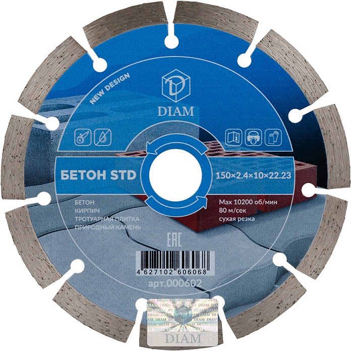 Алмазный отрезной круг Diam STD 1A1RSS Бетон 150 мм (Диам СТД 1А1РСС Бетон 150 мм) – сегментный алмазный диск для сухой резки бетона, кирпича, тротуарной плитки, природного камня, без водяного охлаждения.