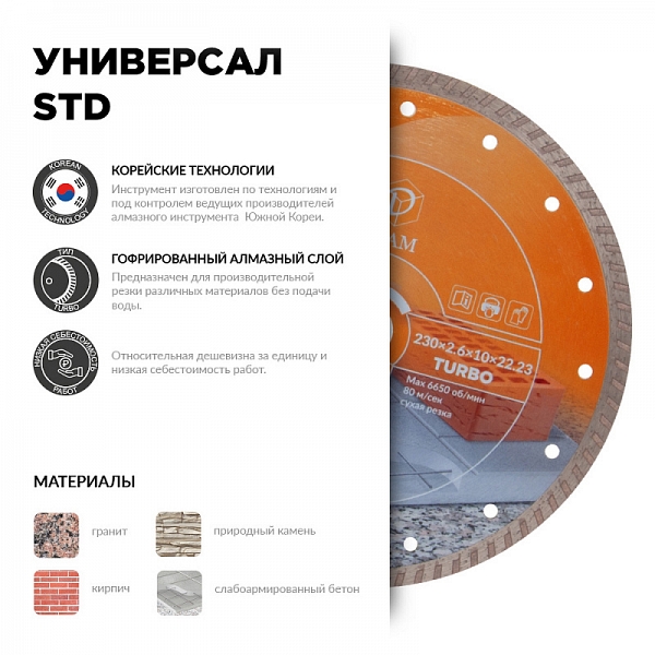 Алмазный отрезной круг Diam STD Turbo Универсал 230 мм (Диам СТД Турбо Универсал 230 мм) – универсальный алмазный отрезной диск тип turbo для сухой резки гранита, кирпича, природного камня, слабоармированного бетона (железобетона) на ручных углошлифовальных машинах (ушм, болгарках), штроборезах, системах резки крупноформатной плитки, бензорезах, электрических резчиках и плиткорезах, ручных стенорезных машинах без водяного охлаждения.