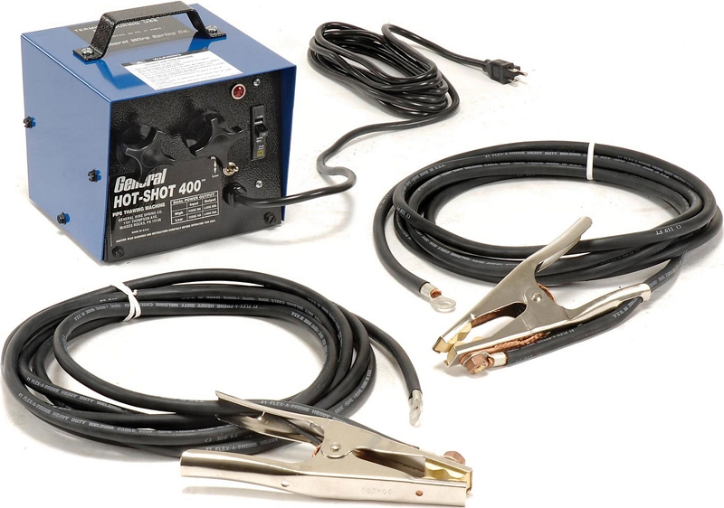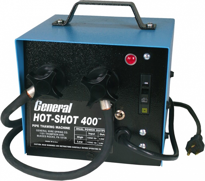 Аппарат для разморозки труб General Pipe Cleaners Дракон 400 (Дженерал Пайп Клинерс Hot Shot 400) предназначен для экстренного разогрева труб Ø 12 – 40 мм (1/2" – 1 1/2") и более, длиной 12 м и более, для удаления ледяных пробок. За считанные минуты удалит ледяную пробку в отрезке трубы длиной до 60 м.