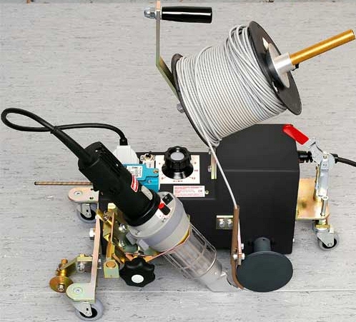 - Прижимной / приводной ролик и ответный ролик с противоположной стороны аппарата образуют две задние точки опоры аппарата. Два передних поворотных ролика расположены на маятниковой подвеске, т.е. фактически образуют одну (третью) точку опоры аппарата. Такая конструкция обеспечивает постоянное давление прижимного ролика на нагретый сварочный пруток, независимо от неровностей поверхности