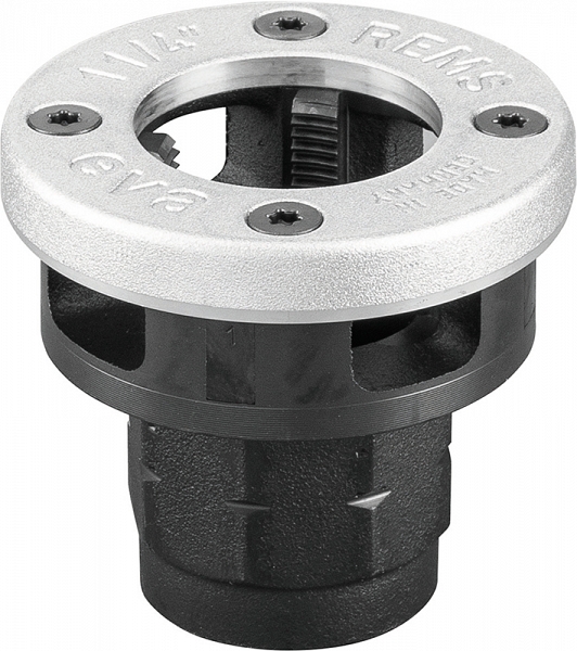 Быстросменная резьбонарезная головка Rems Eva R 1 1/4" (Ремс Ева Р 1 1/4") предназначена для нарезки правой трубной конической резьбы R (ISO 7-1, EN 10226 (DIN 2999, BSPT)) на стальных трубах Ø 1 1/4" с применением ручных и электрических резьбонарезных трубных клуппов Ева, Амиго, Амиго 2, Амиго 2 Компакт.