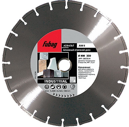 Диск алмазный отрезной Fubag AW-I (Фубаг АВ-И) используется для различного спектра работ, таких, как: обработка кирпича, пемзы, асфальта, кровельной черепицы, свежеуложенного бетона, кварцита на штроборезах, бензорезах, электрических резчиках, плиткорезах электрических, камнерезных станки, резчиках швов с подачей и без подачи воды для охлаждения.