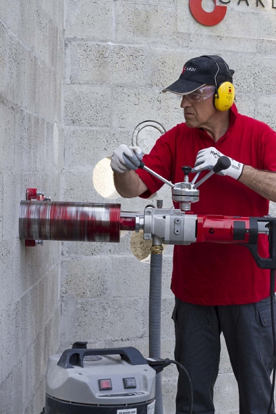 - Применение одного двигателя в различных базовых материалах с подачей воды или сухое сверление с микроударом и подключением промышленного пылесоса