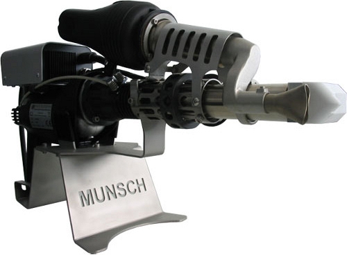 Экструдер шнековый Munsch MAK-32-B (Мюнш МАК-32-Б) – профессиональный ручной сварочный экструдер средней производительности с коллекторным приводом, встроенным нагнетателем воздуха (ручным термофеном), раздельным нагревом присадочного материала и воздуха, интеллектуальным контроллером режимов сварки. Предназначен для сварки емкостей и конструкций из листового ПП, ПЭ, ПВДФ и прочих термопластов первой группы, ПВХ (с ограничениями); оболочек предизолированных труб или фасонных деталей безнапорных трубопроводов толщиной 8 – 25 мм.