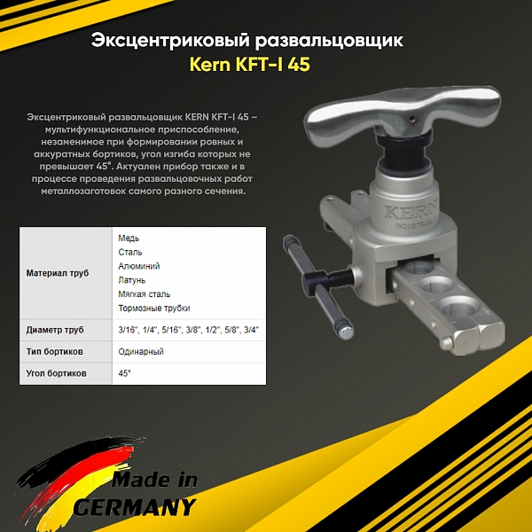 Профессиональный, универсальный высокоточный эксцентриковый развальцовщик Kern KFT-I 45 (Керн КФТ-1 45) предназначен для точного, быстрого и удобного изготовления простых бортиков под 45°. Развальцовка трубок Ø 3/16", 1/4", 5/16", 3/8", 1/2", 5/8", 3/4". Вальцовка и развальцовка трубок и труб: медных, стальных, алюминиевых, латунных и мягкой стали, развальцовка тормозных трубок.