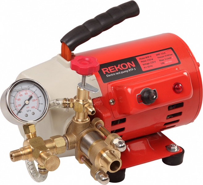 Электрический опрессовщик Rekon RTP-3 (Рекон РТП-3) – электрический опрессовочный насос для точной и быстрой проверки давлением герметичности трубопроводов и резервуаров в системах водоснабжения, теплоснабжения, канализации; сжатого воздуха; солнечных батареях; холодильных установках; системах, заполненных маслом; при изготовлении бойлеров, баллонов со сжатым газом; в котлостроении; при производстве напорных резервуаров; в разводке спринклеров.