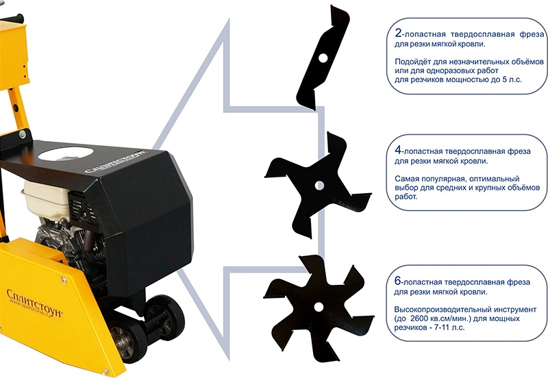 – Рекомендовано применение двухлопастных и четырехлопастных твердосплавных кровельных фрез: если Вы хотите в первый раз попробовать, то можете использовать более дешевую, но менее ресурсную и менее производительную фрезу кровельную твердосплавную двухлопастную Сплитстоун Премиум Кровля 90; рекомендуем, в первую очередь, фрезу кровельную твердосплавную четырехлопастную Сплитстоун Премиум Кровля 180, как более производительную; наиболее производительную и ресурсную фрезу кровельную твердосплавную шестилопастную Сплитстоун Премиум Кровля 270 не рекомендуем использовать на данном резчике кровли, так она рассчитана на большую мощность резчика кровли - Конструкционной особенностью является обратное вращение режущего инструмента, что позволяет избежать выброса мусора в прорезанный шов и обеспечивает высокое качество работ: обратное вращение режущего инструмента способствует быстрому и эффективному выведению шлама из прорезаемых швов, при этом кровельная фреза вспарывает материал мягкой кровли