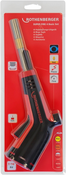 Газовая горелка на баллончик с пьезоподжигом для пайки Rothenberger Super Fire 4 Basic Set (Ротенбергер Супер Файер 4 Бейсик Сет) – эргономичная ручная горелка для пайки труб Ø до 28 мм твердым припоем, Ø до 35 мм мягким припоем.