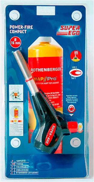 Газовая горелка на баллончик с пьезоподжигом для пайки Super-Ego Power-Fire Compact (Супер-Эго Пауэр-Файер Компакт) – циклонная ручная горелка для профессиональной пайки труб Ø до 28 мм твердым припоем, Ø до 35 мм мягким припоем для соединения и ремонта медных труб, в слесарном деле, автомобильном сервисе и т.д.