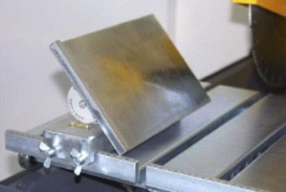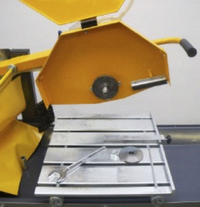 - На легко передвигаемом роликовом рабочем столе заготовка передвигается вперед и назад вдоль рамы под качающейся режущей головой с алмазным диском