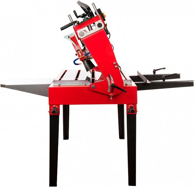 - Обрабатываемый материал лежит неподвижно на рабочем столе, а режущий круг перемещается сверху по направляющим