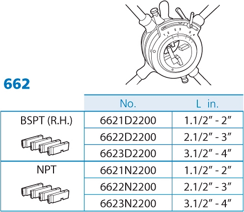 Клупп трубный регулируемый Super-Ego 662 Set 1 1/2"-4" BSPT R (Супер-Эго 662 Сет 1 1/2"-4" БСПТ Р) предназначен для быстрой и качественной нарезки правой конической трубной резьбы BSPT R на стальных трубах Ø 1 1/2" – 4" на стройплощадке при монтаже систем газо- и водоснабжения, отопления, в котлостроении и производстве.