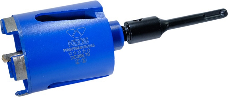 Коронка алмазная для подрозетников Keos Professional M16-SDS Plus 68/70 мм (Кеос Профессионал М16-СДС Плюс 68/70 мм) предназначена для сухого сверления отверстий Ø 68 мм, в том числе и для подрозетников, в бетоне, газобетоне, пеноблоке, кирпиче и прочих материалах, используемых для возведения стен, в том числе и армированном бетоне (железобетоне), с использованием перфоратора или мощной ручной дрели. Идеально подходит для монтажа розеток и других инженерных систем, даже в армированном бетоне, для работы в помещениях с чистовой отделкой, без труда проходит стены и перекрытия для проводки коммуникаций электропроводки, водоснабжения, вентиляции и т.д. без лишней пыли и грязи.