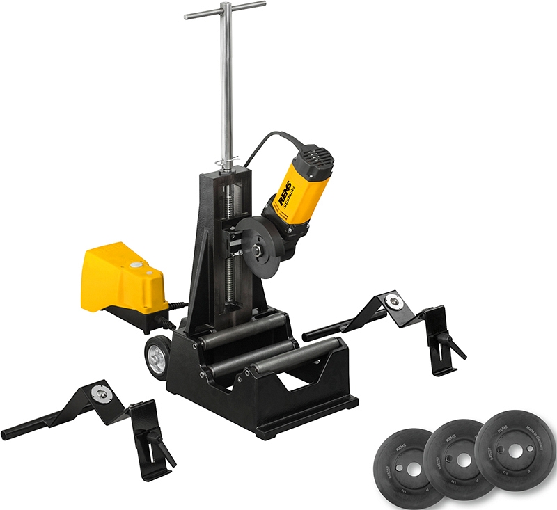 - Rems DueCento Базовый. Труборез для быстрой резки труб Ø 40 – 225 мм под прямым углом, без внешних заусенцев. Для труб систем запрессовки из нержавеющей стали, углеродистой стали, меди, Ø 54 – 225 мм. Для стальных труб EN 10255 (DIN 2440) DN 50 – 150, Ø 2" – 6", чугунных труб (SML) EN 877 (DIN 19522) DN 50 – 200, пластмассовых труб SDR 11, толщина стенки s ≤ 21 мм, Ø 40 – 225 мм, композитных труб Ø 40 – 110 мм. С ненуждающимся в уходе редуктором, универсальным двигателем 230 В, 50 / 60 Гц, 1200 Вт. Число оборотов 115 об/мин. Рабочие ролики из закаленной прецизионной стальной трубы для труб Ø 100 – 225 мм (4" – 6"). Педальный выключатель. Кольцевой ключ. 3 режущих диска. 2 регулируемые по высоте подставки под трубы Ø 100 – 225 мм (4" – 6"). В коробке