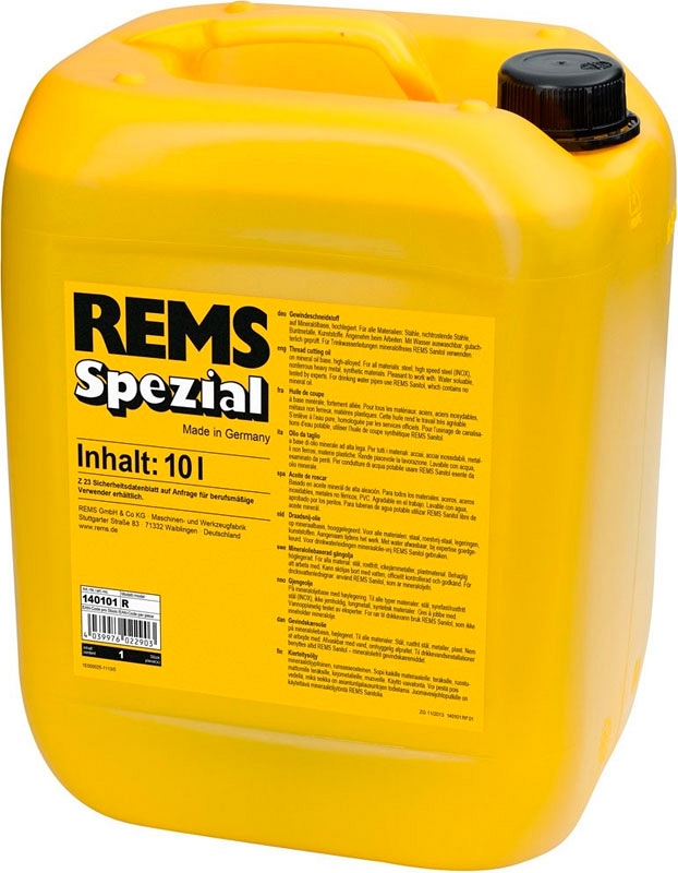 Высоколегированная минеральная смазка для нарезания резьбы Rems Spezial 10 л (Ремс Специаль 10 л) на основе минеральных масел разработана специально для нарезания резьбы, поэтому имеет особенно высокие смазывающие и охлаждающие свойства, а также используется для пиления металлов.