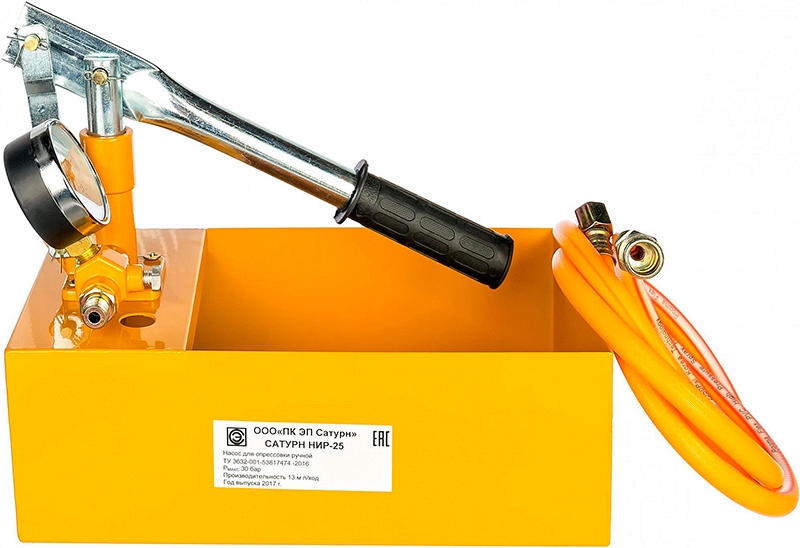 Насос опрессовочный ручной Сатурн НИР-25Э – гидравлический опрессовщик с манометром для быстрой и точной опрессовки, заполнения, проверки давления и герметичности масляных, водяных и антифризных систем трубопроводов и резервуаров.