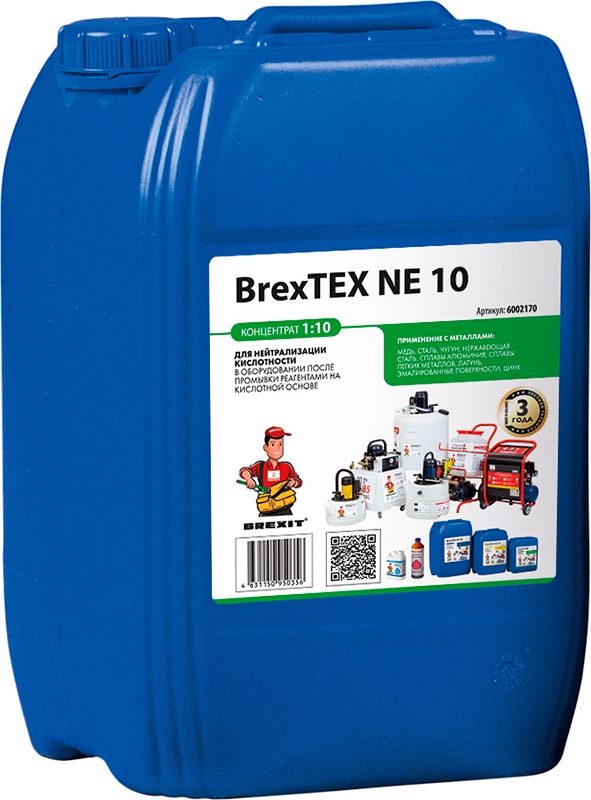 Модель снята с производства! Нейтрализатор кислоты Brexit BrexTex NE 10 (Брекзит БрекзТекс НЕ 10) – химическое средство (реагент) для нейтрализации остаточной кислотности после промывки теплообменников, котлов, систем отопления кислотными реагентами.