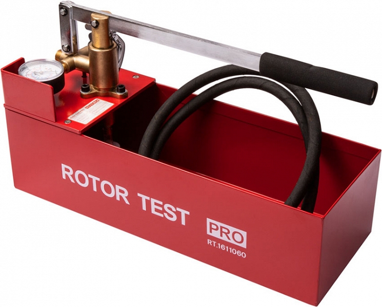 Опрессовщик гидравлический ручной Rotorica Rotor Test Pro (Роторика Ротор Тест Про) – насос опрессовочный ручной одноклапанный для проверки герметичности контуров отопительных, холодильных, спринклерных систем; гидравлических испытаний систем отопления, водоснабжения, солнечных коллекторов, резервуаров и т.д.; быстрой ручной опрессовки систем отопления; проверки на утечку отопительных и воздушных контуров, холодильных систем, масляных и спринклерных систем и многих других трубных установок; проверки на герметичность давлением до 60 бар; ежедневного профессионального использования.