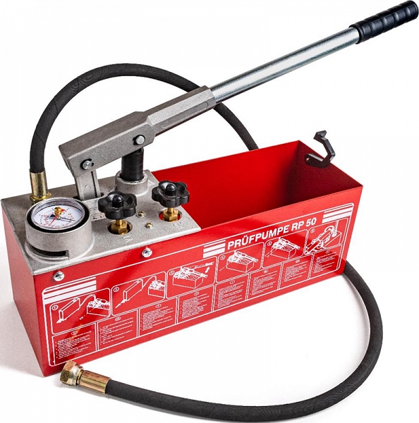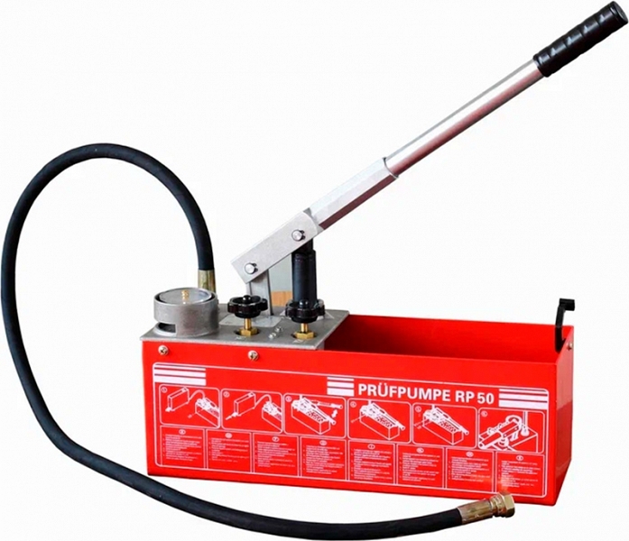 Опрессовщик гидравлический ручной Shtall RP50 (Шталл РП50) – испытательный опрессовочный насос с манометром для диагностики герметичности, заполнения и испытания давлением до 60 бар отопительных, канализационных, водопроводных гидросистем; легкого и быстрого выявление протечки в системе отопления, охлаждения, орошения без подключения к электросети.