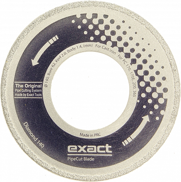 Отрезной алмазный диск Exact Diamond 140 (Экзакт Диамонд 140) предназначен только для резки чугунных труб. Подходит для электрических труборезов Exact PipeCut 170, 170E, 220E, 200, 360.