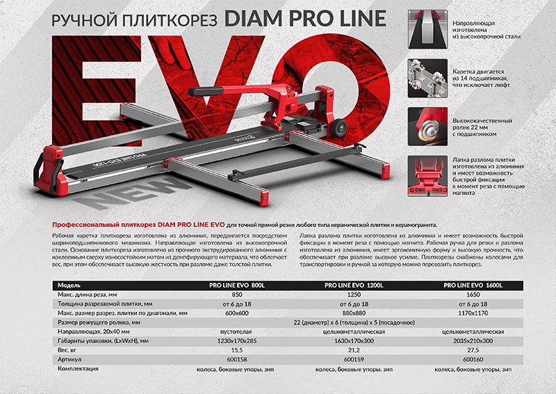 Плиткорез ручной Diam Pro Line Evo-1200L (Диам Про Лайн Эво-1200Л) серии Pro Line – профессиональный плиткорез для точной прямой резки любого типа керамической плитки и керамогранита.
