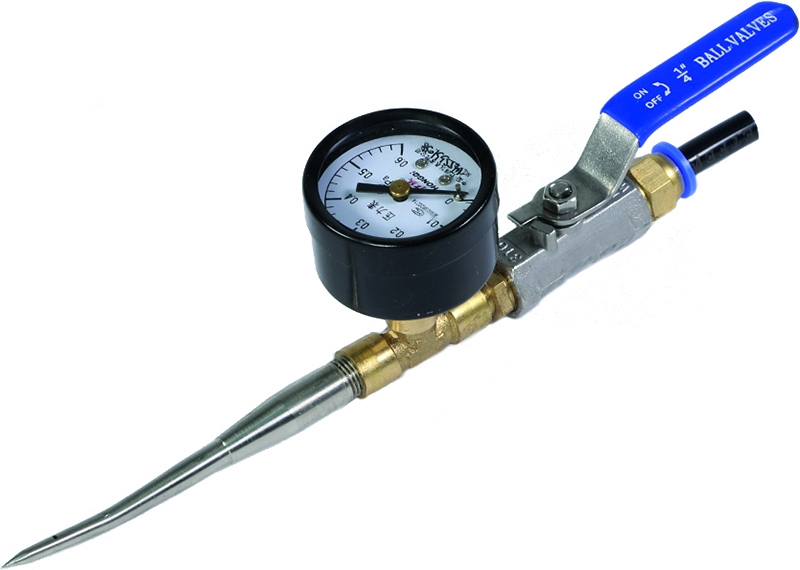 Проверочная игла для проверки двойного шва Weldy 6 бар (Велди 6 бар) с манометром, вентелем подачи сжатого воздуха и клапаном подключения шланга сжатого воздуха предназначена для проверки герметичности и качества двойных сварочных швов избыточным давлением воздуха при сварке внахлест полимерных мембран, пленок, геомембран, гидроизолирующих покрытий с межшовным (проверочным) каналом на строительных площадках в подземном, гидростроительстве, укладке (монтаже) балластных кровельных покрытий (систем).
