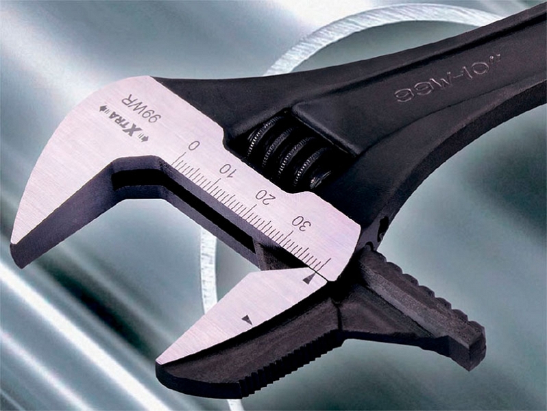 - Реверсивная съемная губка с Xtra широким раскрытием позволяет одновременно удобно работать с гайками большого размера и трубами большого диаметра одним разводным ключом