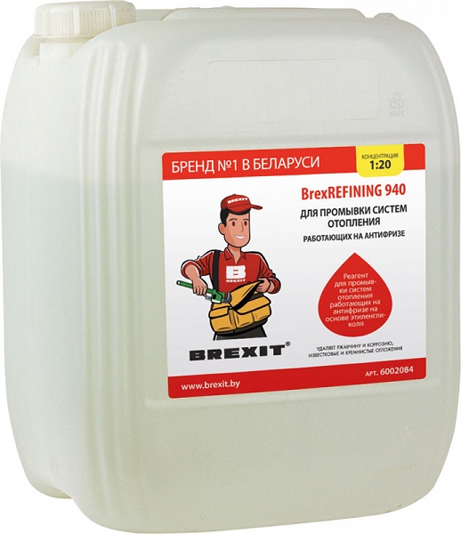 Реагент для промывки системы отопления на антифризе этиленгликоль Brexit BrexRefining 940 (Брекзит БрекзРифайнинг 940) – профессиональное концентрированное химическое средство для сервисного обслуживания и промывки систем отопления, где в качестве теплоносителя используется антифриз на основе этиленгликоля, от продуктов распада, образованных в результате разложения теплоносителя, а также для удаления ржавчины и коррозии, известковых и кремниевых отложений.