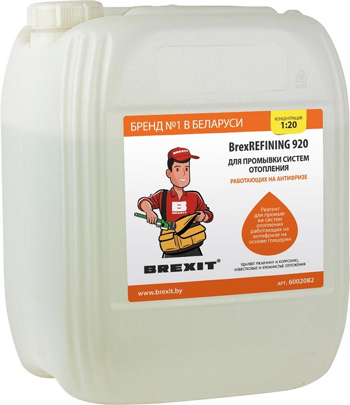 Реагент для промывки системы отопления на антифризе глицерин Brexit BrexRefining 920 (Брекзит БрекзРифайнинг 920) – профессиональное концентрированное химическое средство для сервисного обслуживания и промывки систем отопления, где в качестве теплоносителя используется антифриз на основе глицерина, от продуктов распада, образованных в результате разложения теплоносителя, а также для удаления ржавчины и коррозии, известковых и кремниевых отложений.