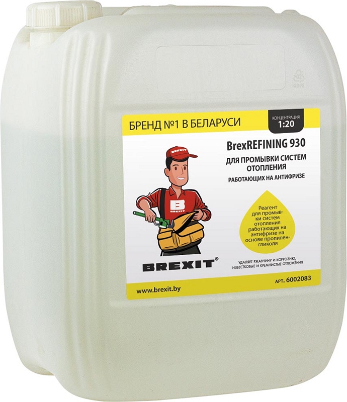 Реагент для промывки системы отопления на антифризе пропиленгликоль Brexit BrexRefining 930 (Брекзит БрекзРифайнинг 930) – профессиональное концентрированное химическое средство для сервисного обслуживания и промывки систем отопления, где в качестве теплоносителя используется антифриз на основе пропиленгликоля, от продуктов распада, образованных в результате разложения теплоносителя, а также для удаления ржавчины и коррозии, известковых и кремниевых отложений.