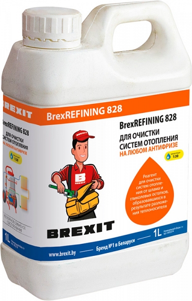Реагент для промывки системы отопления на любом антифризе Brexit BrexRefining 828 (Брекзит БрекзРифайнинг 828) – профессиональное химическое средство для очистки инженерных систем систем, где в качестве теплоносителя применяется любой антифриз, от продуктов гликолевого распада, образованных в результате разложения теплоносителя; сервисного обслуживания перед заменой антифриза.