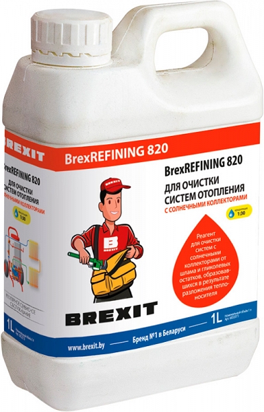 Реагент для промывки системы отопления с солнечными коллекторами Brexit BrexRefining 820 (Брекзит БрекзРифайнинг 820) – профессиональное химическое средство для очистки инженерных систем систем от продуктов гликолевого распада, образованных в результате разложения теплоносителя; сервисного обслуживания солнечных коллекторов перед заменой антифриза.