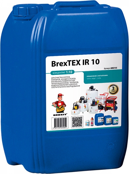 Реагент для промывки теплообменников и систем отопления Brexit BrexTex IR 10 (Брекзит БрекзТекс ИР 10) – профессиональное кислотное моющее средство для удаления накипи, ржавчины, шлама, известкового налета и прочих загрязнителей с внутренней поверхности котельного, теплообменного, холодильного оборудования, бойлеров и т.д., требующего периодической очистки.