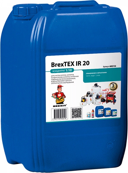 Реагент для промывки теплообменников и систем отопления Brexit BrexTex IR 20 (Брекзит БрекзТекс ИР 20) – профессиональное кислотное моющее средство для удаления накипи, ржавчины, шлама, известкового налета и прочих загрязнителей с внутренней поверхности котельного, теплообменного, холодильного оборудования, бойлеров и т.д., требующего периодической очистки.