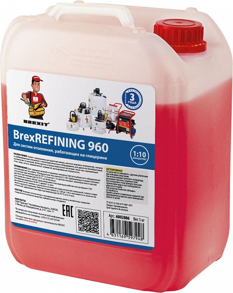 Реагент для промывки теплообменников и системы отопления на антифризе глицерин Brexit BrexRefining 960 (Брекзит БрекзРифайнинг 960) – профессиональное сильнодействующее концентрированное химическое средство на основе каустической соды для сервисного обслуживания и промывки систем отопления, где в качестве теплоносителя используется антифриз на основе глицерина, от продуктов распада, образованных в результате разложения теплоносителя, а также для удаления ржавчины и коррозии, известковых и кремниевых отложений; для удаления смазок, масляно-жировых зягрязнений, нагаров и комбинированных отложений с теплоэнергетического оборудования; для удаления биообрастаний, и органических отложений; для промывки новых систем перед запуском как первая стадия комплексной промывки теплообменного оборудования и трубопроводов, обеспечивая размягчение загрязнений и облегчая работу кислотному средству на второй стадии; для очистки деталей и наружных поверхностей оборудования от смазок, масел, жиров; используется со всеми известными металлами, такие, как: нержавеющая сталь, медь, латунь, черный металл, алюминий, хромированные поверхности.