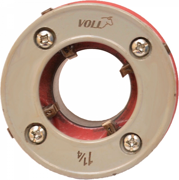 Резьбонарезная головка для электрического клуппа Voll BSPT R SS 1 1/4" (Волл БСПТ Р СС 1 1/4") предназначена для нарезания правой трубной конической резьбы BSPT R на стальных водопроводных и газопроводных трубах Ø 1 1/4". Идеально подходит для использования в электрических резьбонарезных клуппах Voll с использованием смазочно-охлаждающей жидкости Voll. Может использоваться с электрическими и ручными клуппами некоторых других производителей (совместимость уточняйте у специалистов).